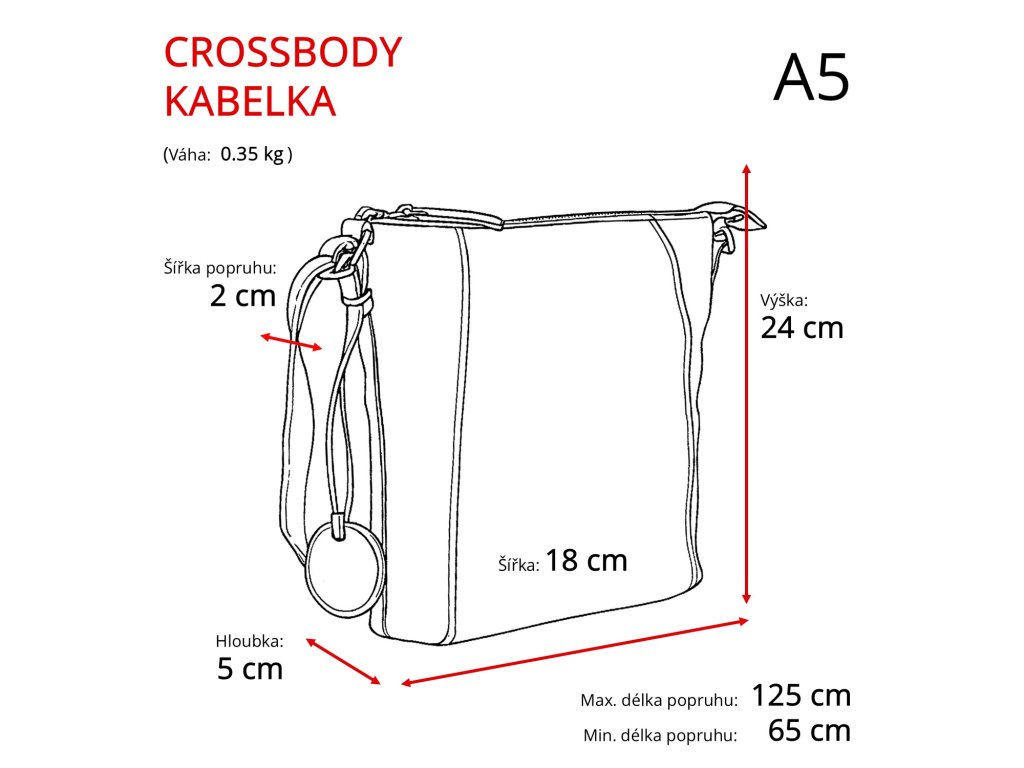 - Kabelka má prodlužovací popruh - minimální délka je 85 cm a maximální 155 cm, šířka popruhu 2 cm.