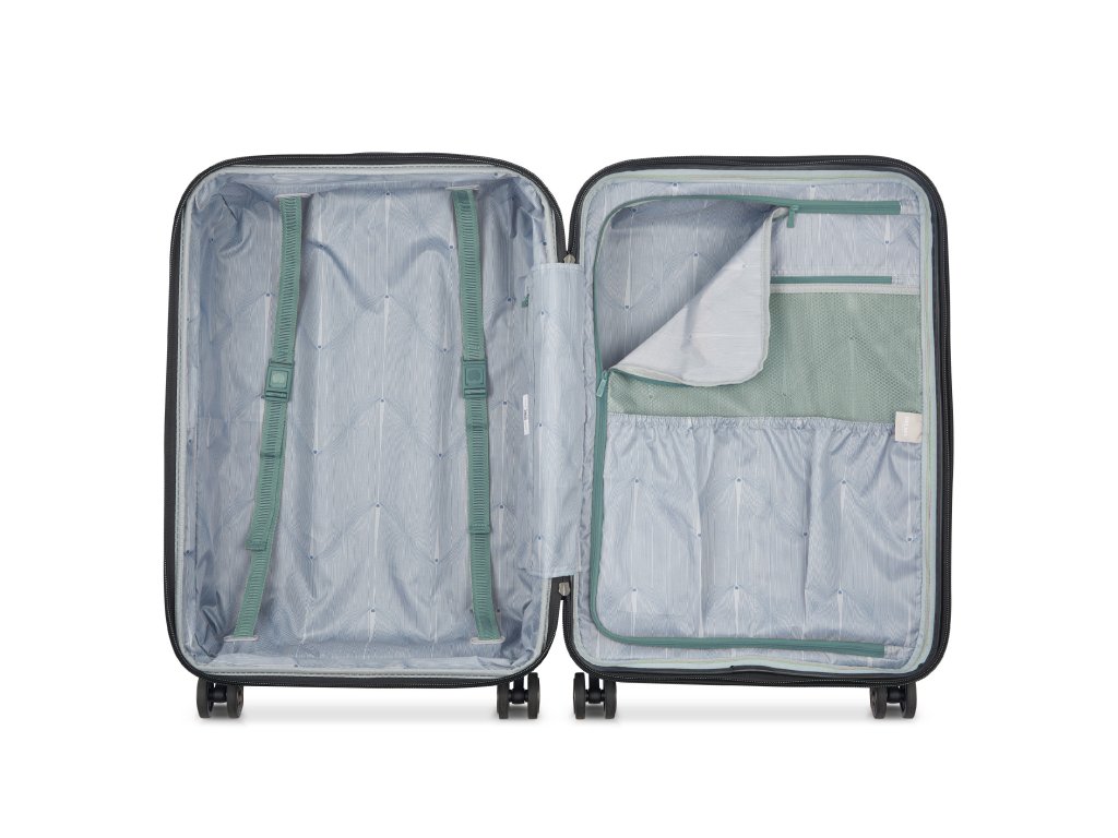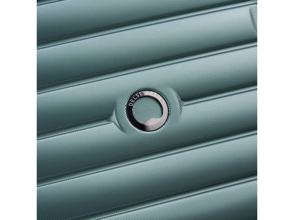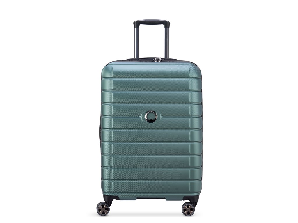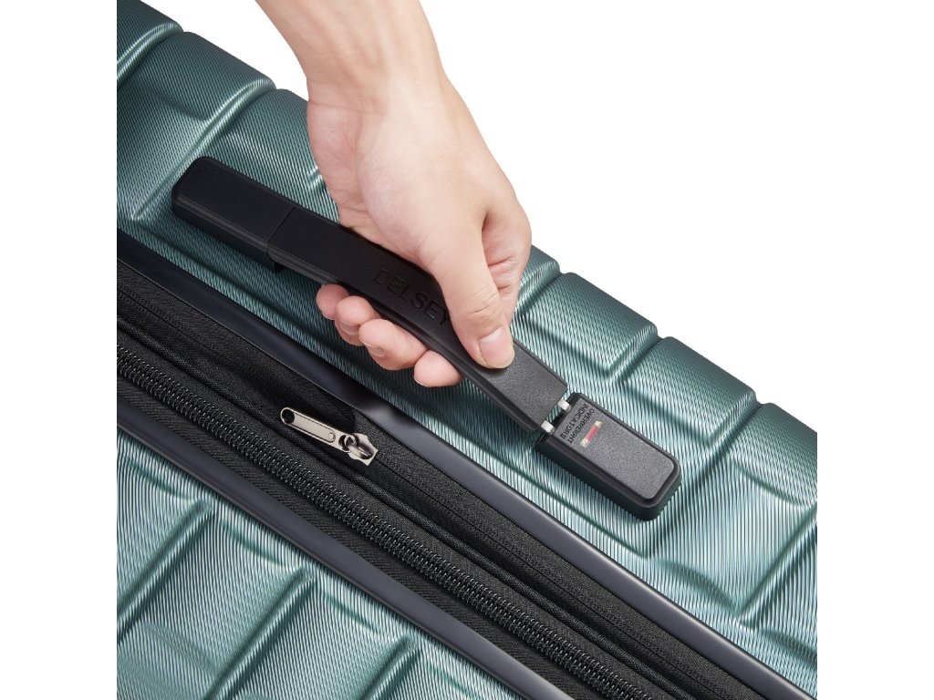 Lifestylová řada kufrů Delsey Shadow 5.0 ve stylové zelené barvě s indikátorem přetížení kufru.