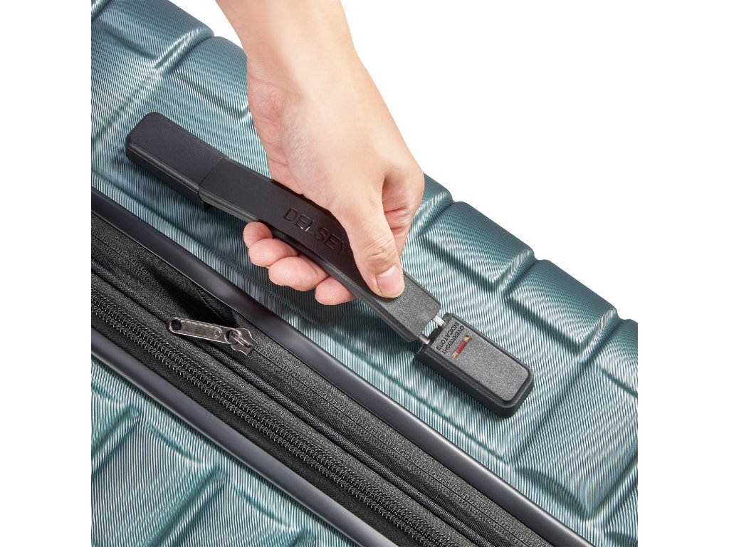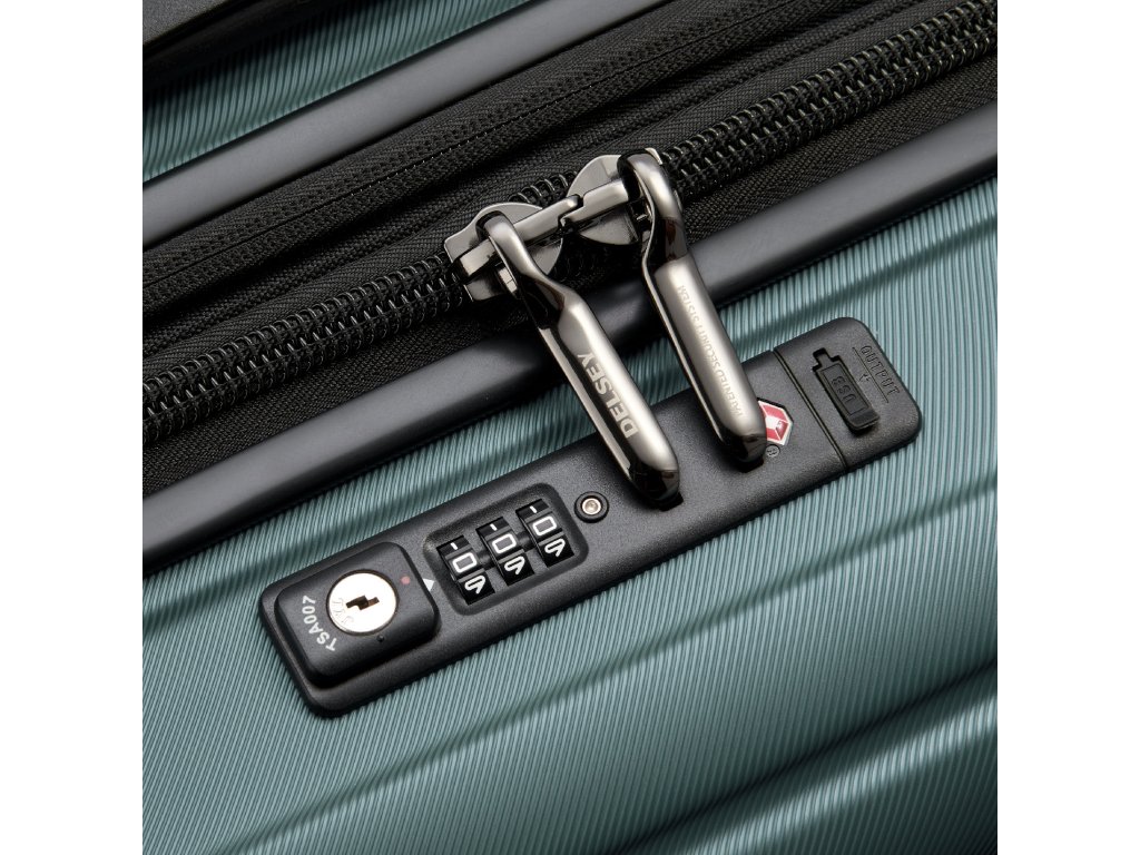 Lifestylová řada kufrů Delsey Shadow 5.0 ve stylové zelené barvě s indikátorem přetížení kufru.