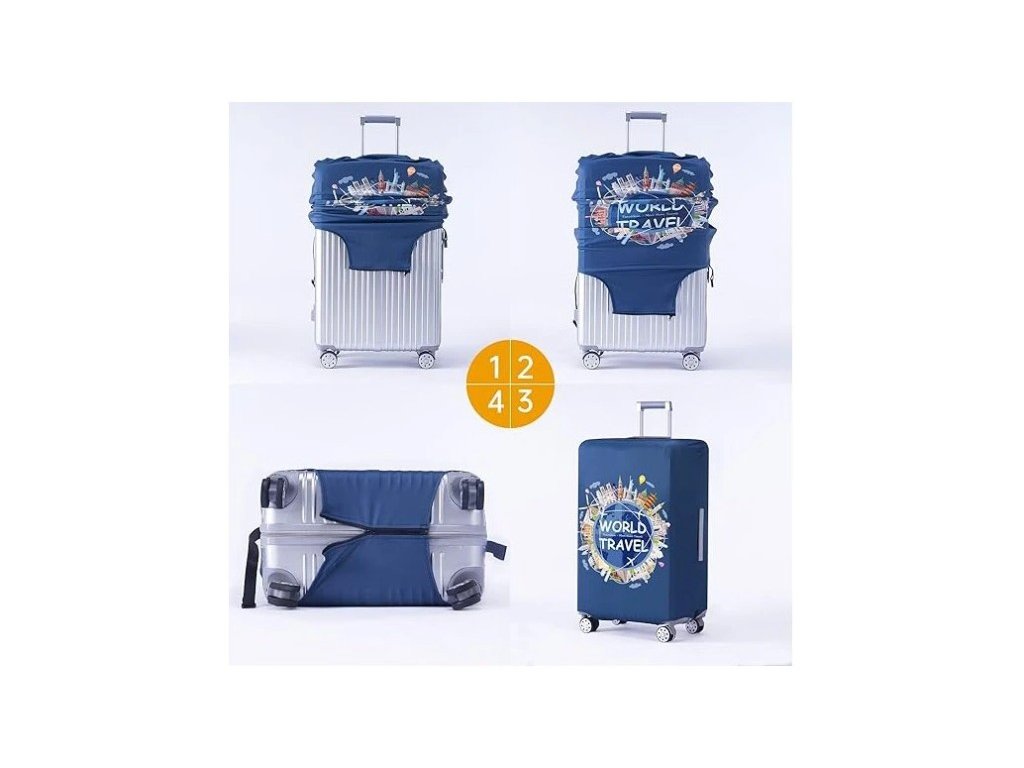 - obal jednoduše natáhne na kufr a dole uzavře pomocí suchého zipu a elastického pásku s přezkou