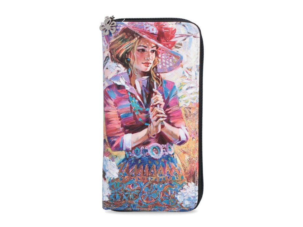Dámská designová peněženka typu penál s barevným potiskem - dívka s kloboukem.