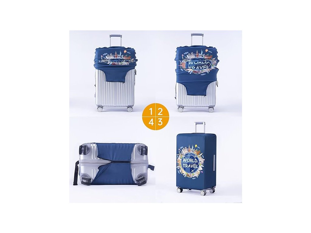 - obal jednoduše natáhne na kufr a dole uzavře pomocí suchého zipu a elastického pásku s přezkou